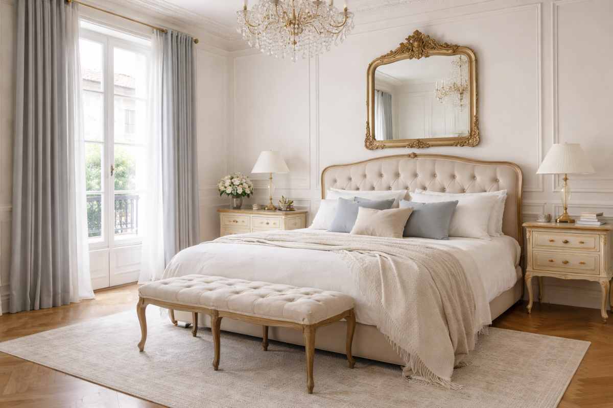 Meglio pochi pezzi ben fatti piuttosto che riempire ogni angolo. Tra gli oggetti più iconici dello stile parigino c’è il lampadario chandelier, spesso in vetro o ottone. Anche uno specchio grande con cornice dorata può trasformare completamente una stanza.